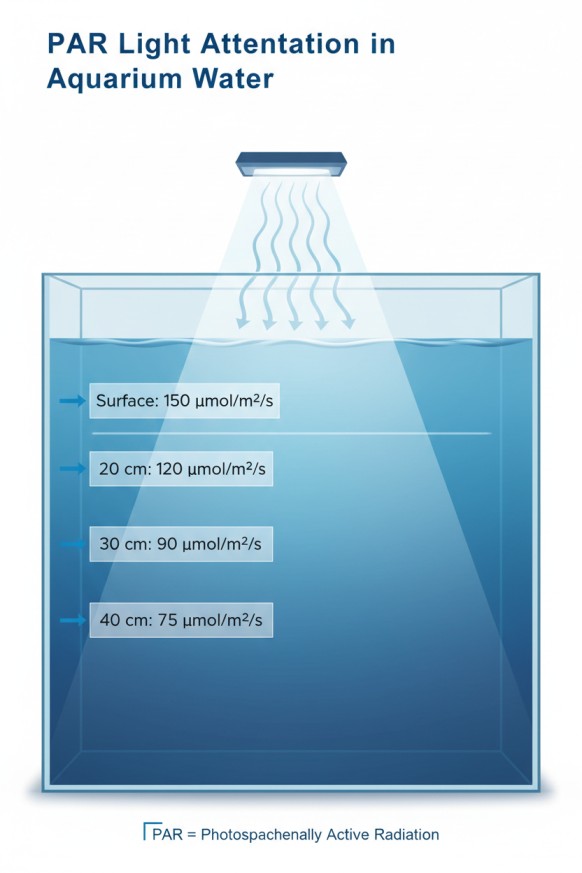 Here's something many aquarists overlook: PAR values decrease significantly as light travels through water. A light that delivers 150 μmol/m²/s at the surface might only provide 75 μmol/m²/s at 40 cm depth.